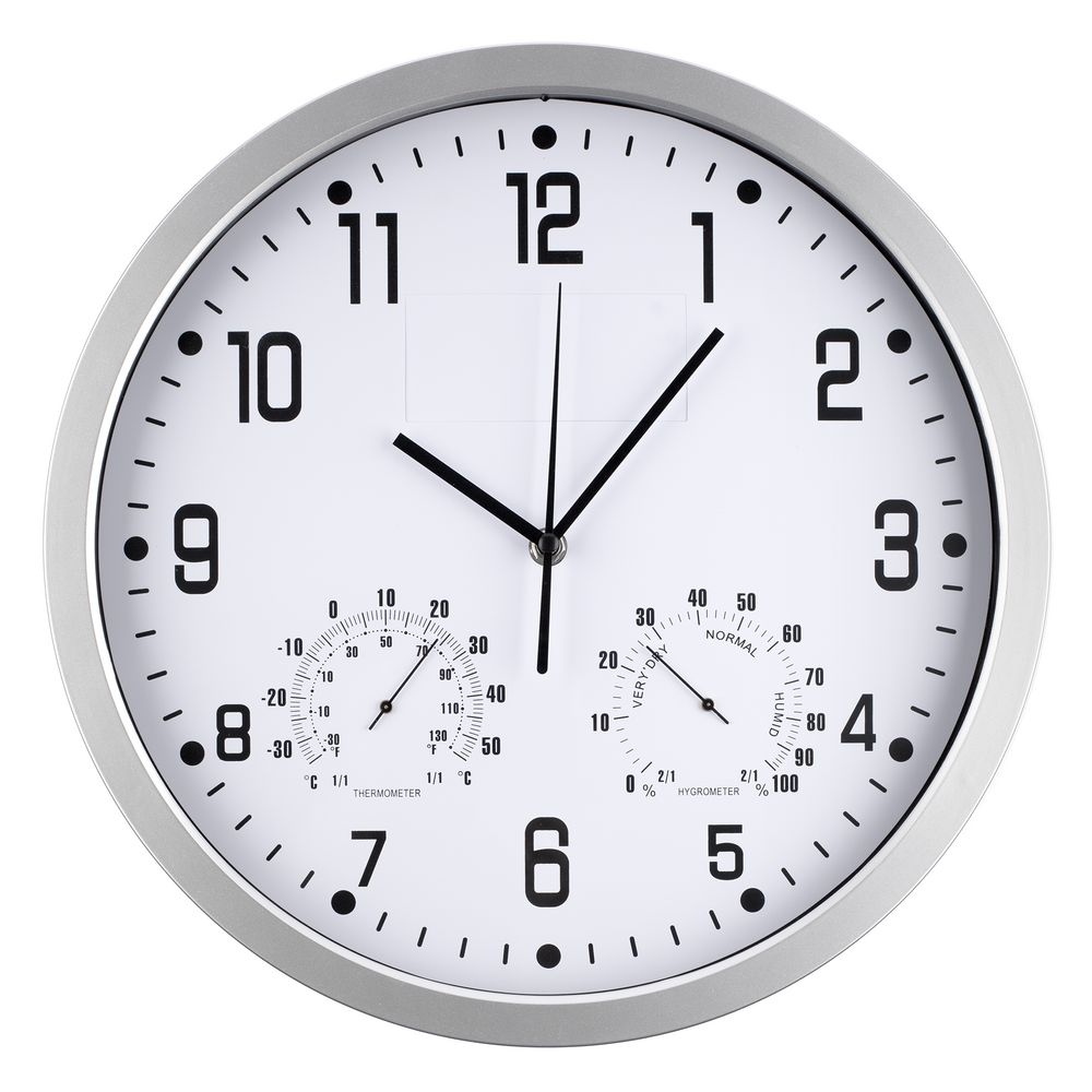 Классические настенные часы с термометром и гигрометром. В верхней части циферблата находится планка для нанесения логотипа, которая легко извлекается с тыльной стороны корпуса.