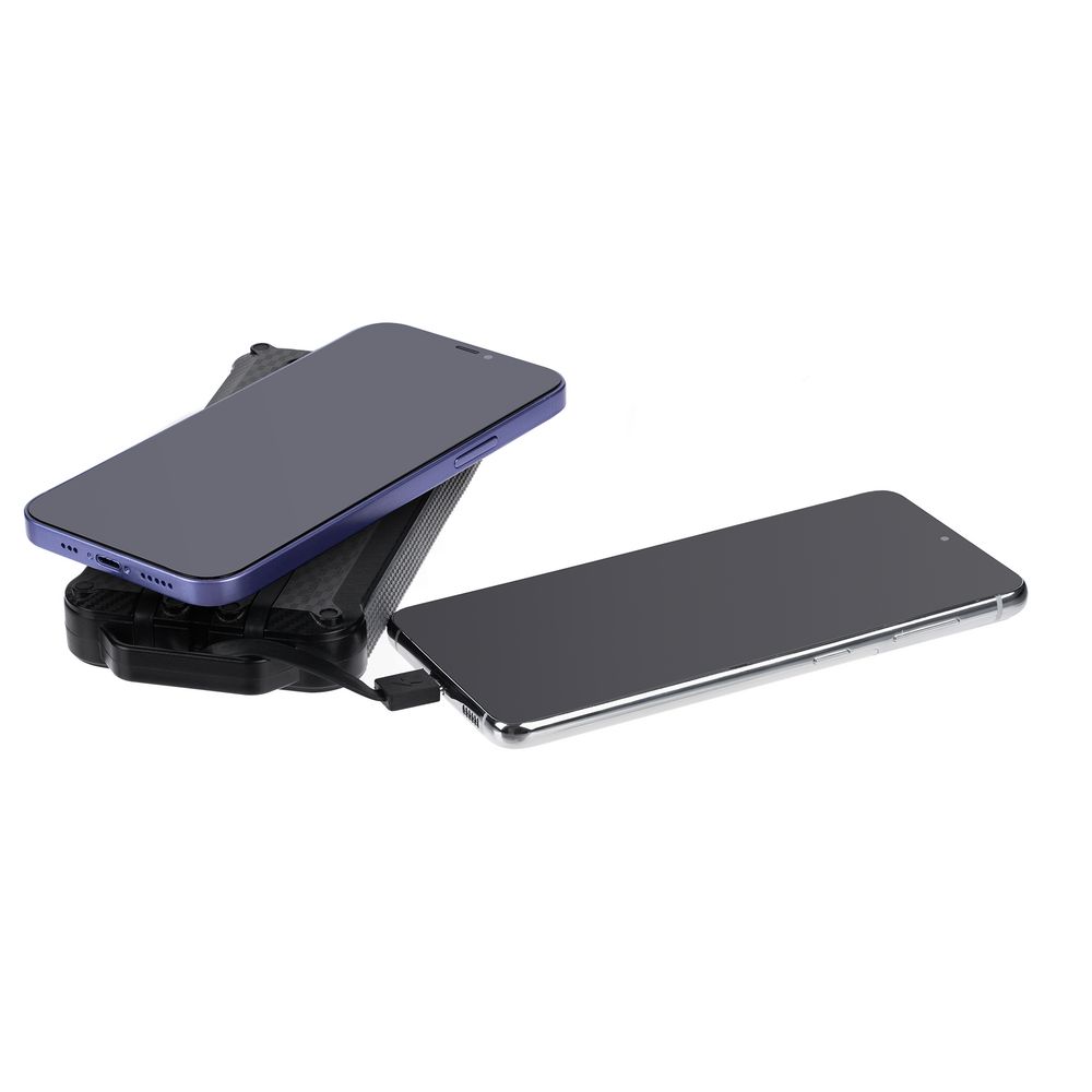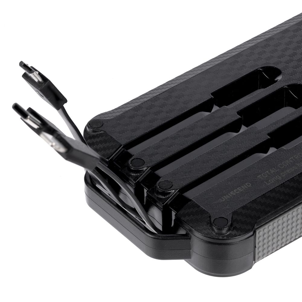 Total Control — настоящий outdoor-аккумулятор с ударопрочным корпусом и защитой от пыли и брызг, который не страшно взять в поход. Область для беспроводной зарядки и 3 встроенных кабеля с разъемами Micro USB, Type C и Lightning позволяют удобно заряжать разные типы устройств, а солнечная батарея просто не позволит остаться совсем без связи. Яркий фонарик осветит путь или послужит светильником в палатке.