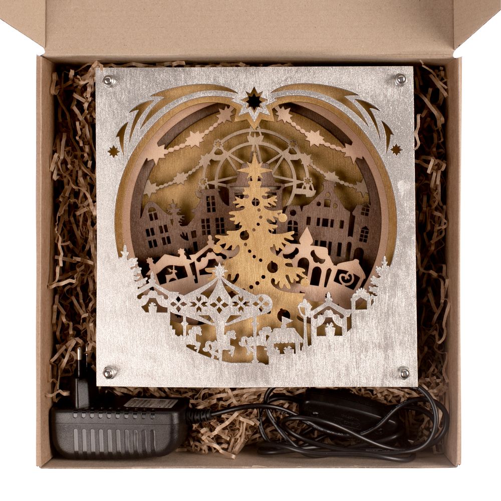 Ночник Merry Christmas с объемными резными изображениями создаст по-настоящему праздничное настроение и погрузит в сказочную атмосферу. В его многослойных очертаниях угадывается знакомый сюжет рождественской ярмарки — участником может стать любой фантазер!