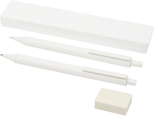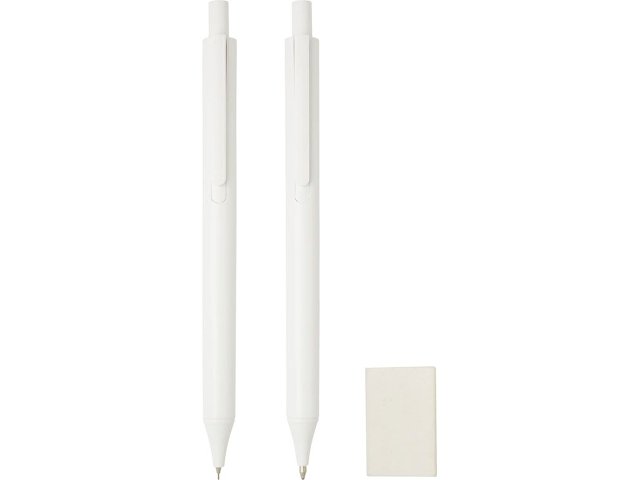 Комплект антибактериальных канцелярских принадлежностей, состоящий из шариковой ручки с нажимным механизмом, механического карандаша и ластика. Нанопорошковая добавка уменьшает рост микроорганизмов на поверхности ручек.