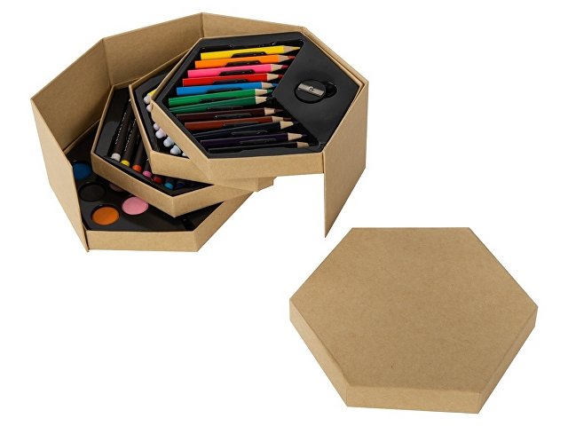 Набор из 52 предметов для рисования. 12 маркеров, 12 цветных карандашей, 12 восковых карандашей, 12 акварельных красок, кисточка, точилка, резинка и большая скрепка.