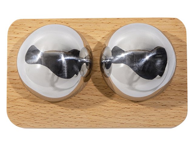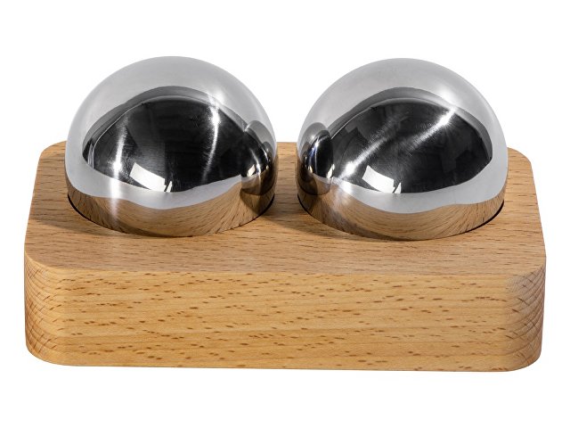 Набор состоит из двух сфер, выполненных из нержавеющей стали, и подставки из дерева, которая позволяет хранить их надлежащим образом и не дает укатываться с полки.
