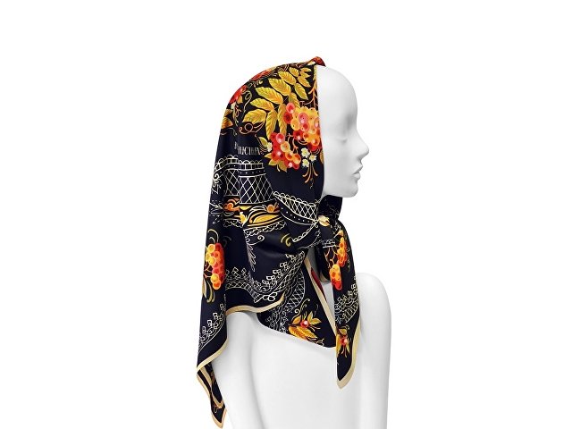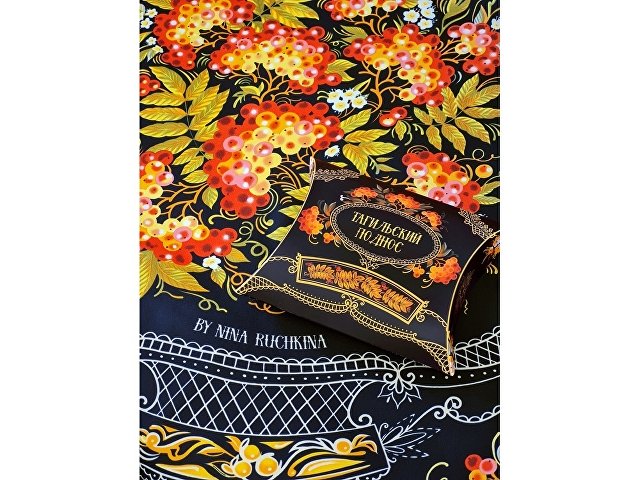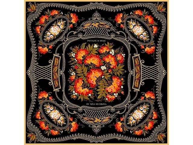 Платок «Тагильский поднос» станет ярким акцентом в вашем гардеробе. Насыщенная терракотово-чёрная цветовая гамма плодов всегда актуальна, а нежные оттенки цветов рябины внесут настроение романтичности и легкости.