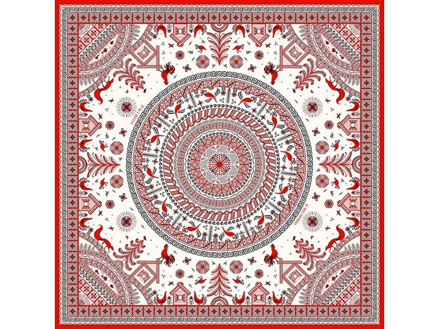 Самобытный орнамент знаменитой мезенской росписи, отличающейся зашифрованным символизмом, лег в основу элегантного платка “Мезенская роспись. Петух и лиса». Каждый элемент принта имеет особое значение, и располагается в строго определенном месте, создавая целый рассказ. Ранее такими рисунками украшали избы, посуду и кухонную утварь, передавая послание поколениям.