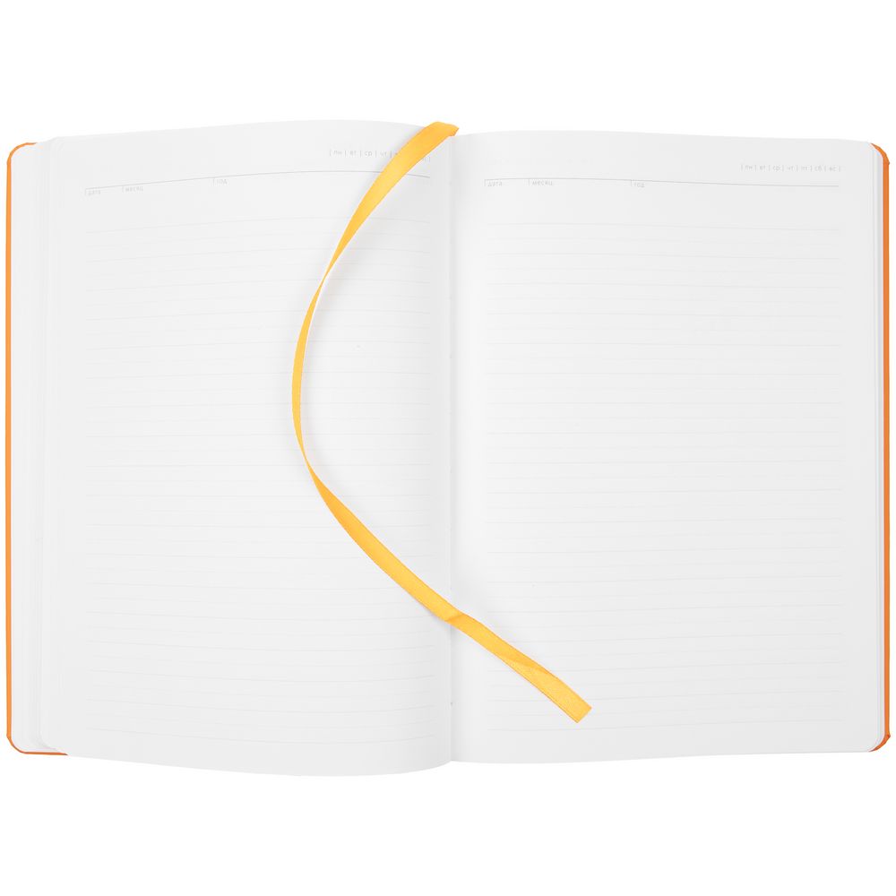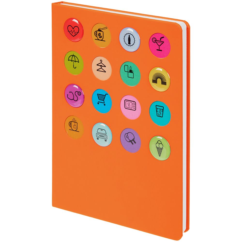 Обложка ежедневника из материала Soft Touch. На корешке обложки выполнено блинтовое тиснение, обложка дополнена вырубкой с печатью на бумаге и полимерными наклейками под смолой.