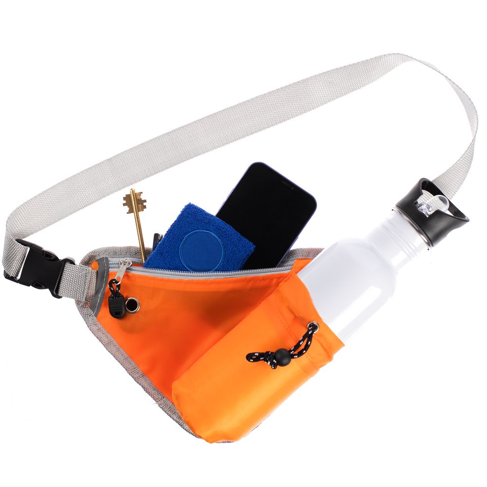 Сумка имеет внешний карман на молнии для хранения телефона и полезных мелочей и отделение со шнуром-фиксатором под бутылку для воды диаметром до 7 см. Ремень выполнен из прочной регулируемой стропы. Светоотражающие детали помогут оставаться заметными во время тренировок в сумерках и темноте.