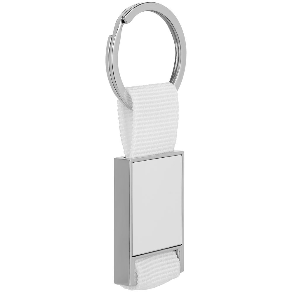 Элегантный металлический брелок с тканевой вставкой. Логотип можно нанести на гелиевой пластине посредине.