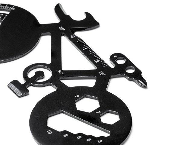 Многофункциональный инструмент из нержавеющей стали в форме велосипеда. 11 функций: открывалка для консервных банок, угловой транспортир, отвертки, гаечные ключи и линейки.