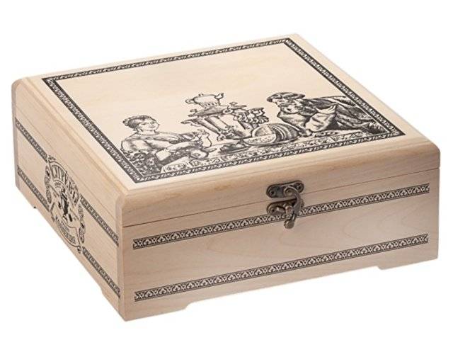 Подарочный набор из семи эксклюзивных купажей листового чая, характерных для разных регионов России и елки ручной работы с натуральным вареньем, в сувенирной шкатулке из массива берёзы.