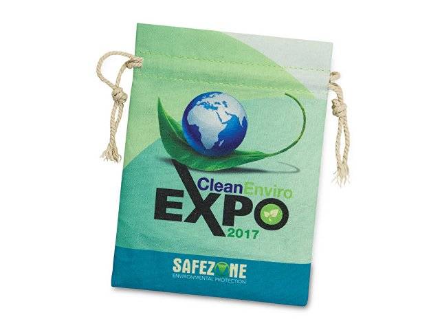 Подарочный мешочек среднего размера из хлопка плотностью 140 г/м2 на завязках с возможностью полноцветной печати.