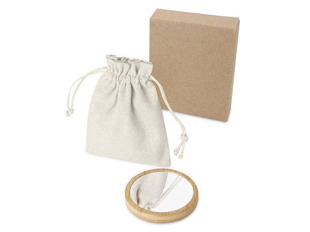 Круглое зеркало из бамбука в хлопковом мешочке.