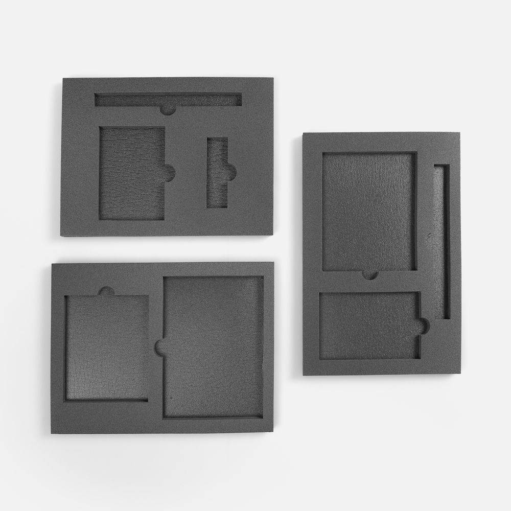 Ложемент, изготовленный из материала Izolon 500 черного цвета, представляет собой многослойную конструкцию, состоящую из нижнего слоя толщиной 5 мм и верхнего слоя толщиной 10 мм. В соответствии с утвержденным макетом, проемы для размещения предметов могут быть спроектированы как в одном, так и в обоих слоях.