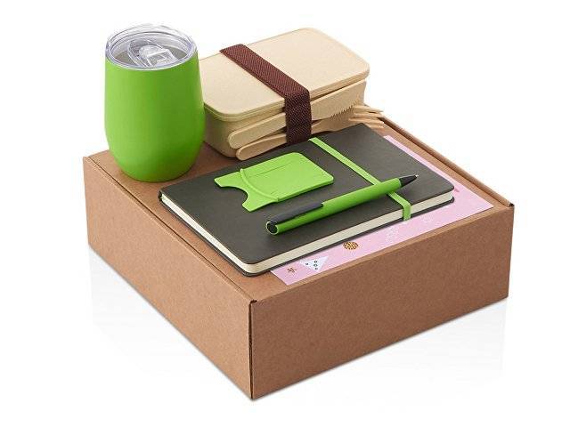 Набор с термокружкой, блокнотом, ручкой и ланчбоксом "Refreshment", зеленое яблоко