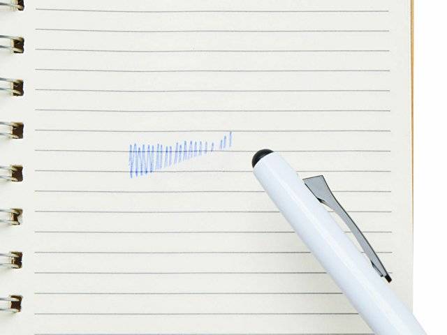 Пластиковая шариковая ручка со стирающимися чернилами. Синие чернила стираются с помощью ластика в верхней части ручки.