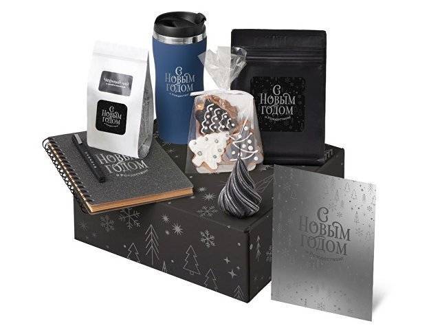 Подарочный набор c термокружкой, чаем, кофе и блокнотом, темно-синий