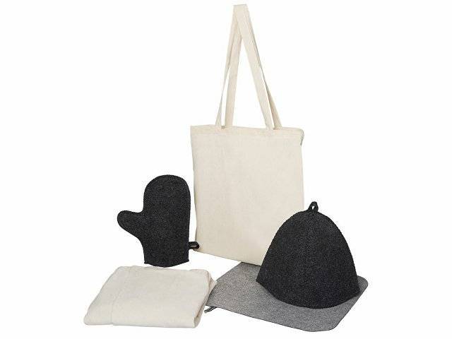 Создайте уют в парной: женский холщовый килт, шапка, коврик и рукавица — всё необходимое для отдыха, аккуратно сложено в хлопковый шоппер.