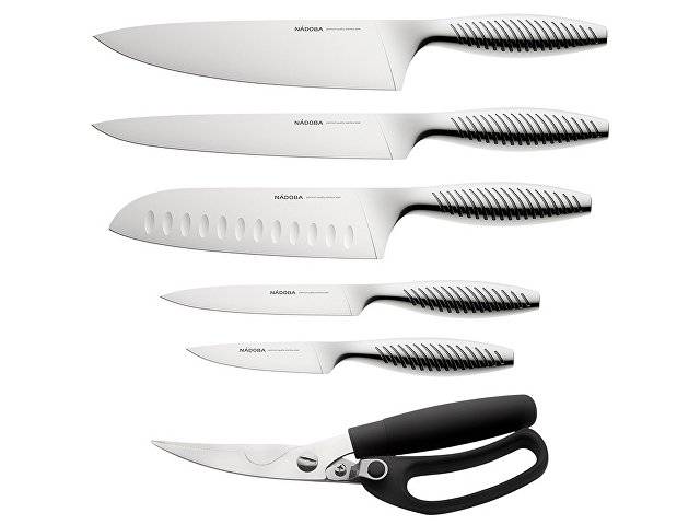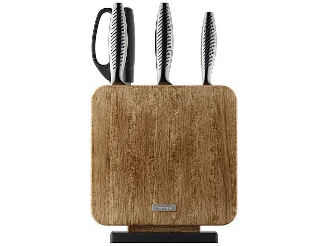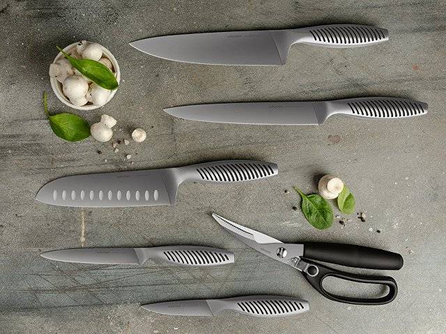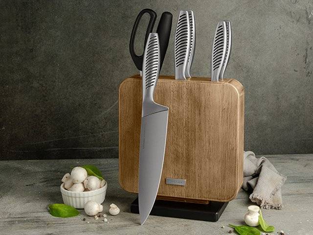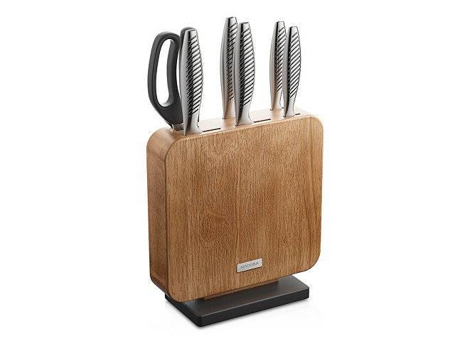 Набор цельнокованых ножей и ножниц в блоке включает в себя ножи: поварской 20 см, разделочный 20 см, Сантоку 18 см, универсальный 12,5 см, овощной 9 см и кухонные многофункциональные ножницы.