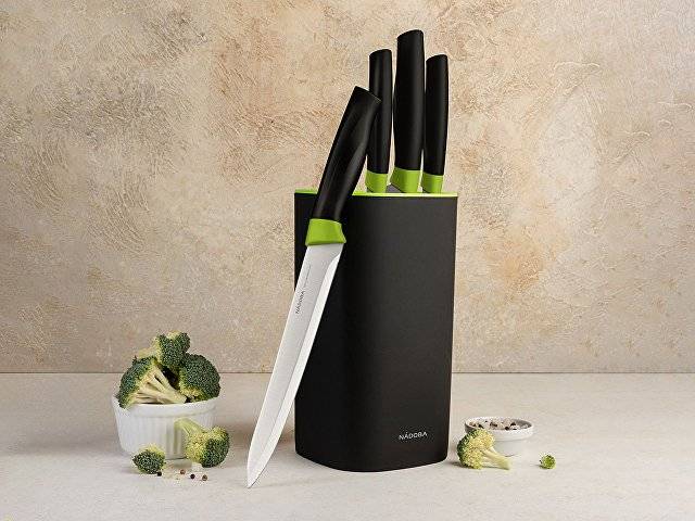 Набор ножей 5 предметов NADOBA серии Olivia состоит из: нож овощной, 9 см, нож универсальный, 12,5 см, нож разделочный, 20 см, нож поварской, 20 см и универсального блока для хранения ножей.