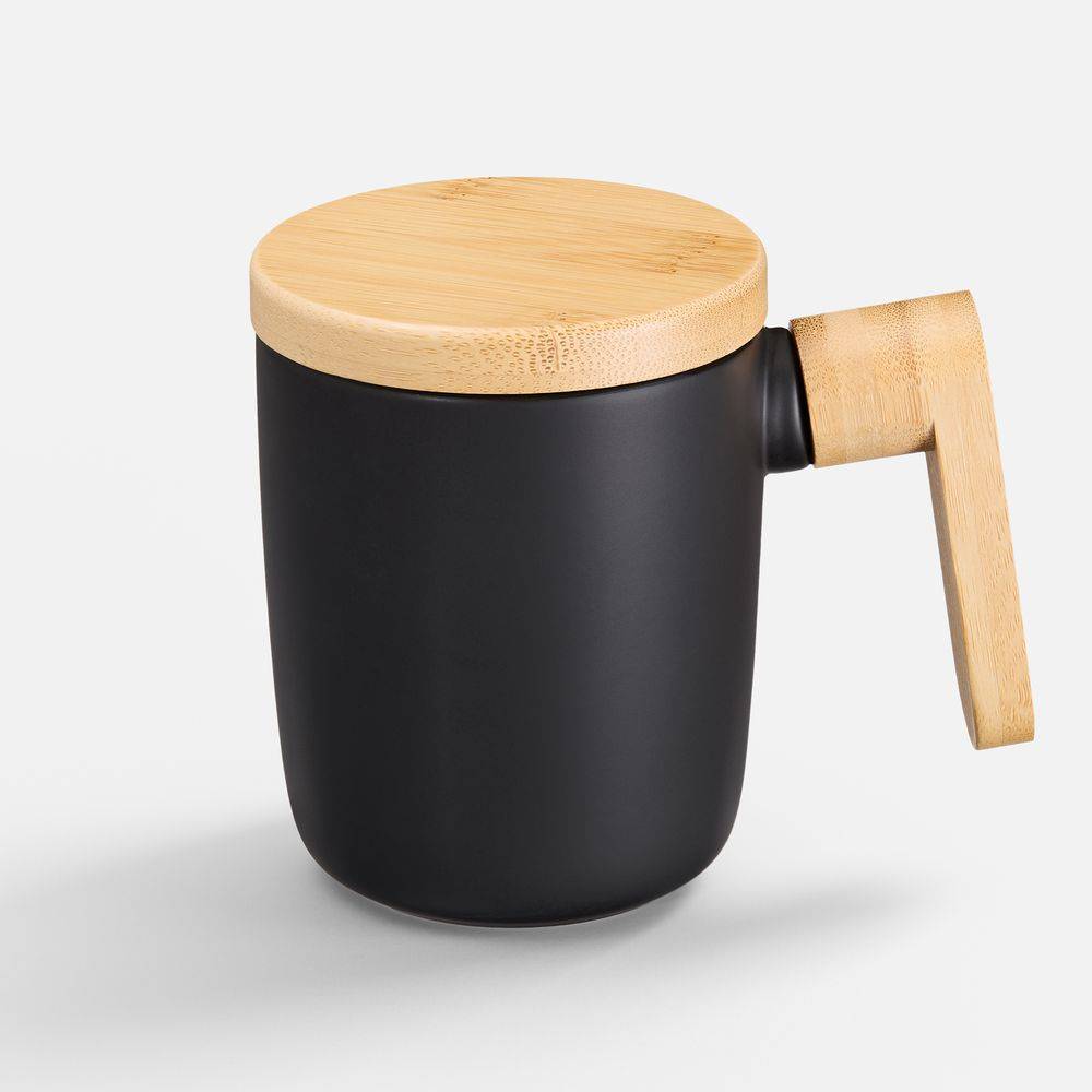 Стильная кружка с крышкой и ручкой из бамбука станет самой любимой на полке.