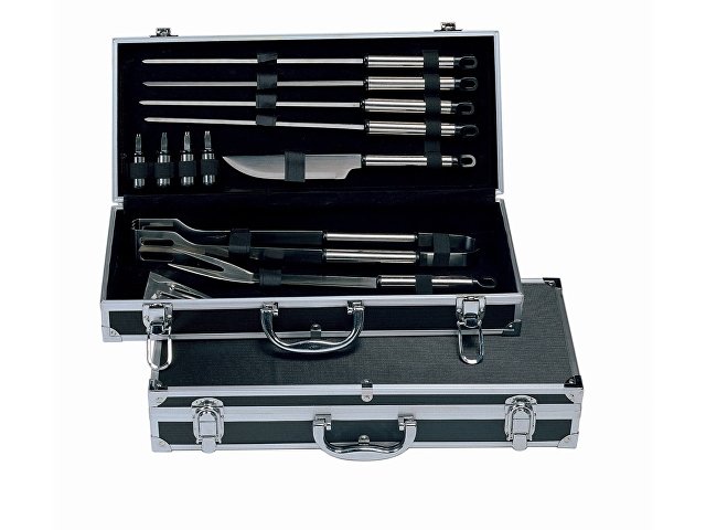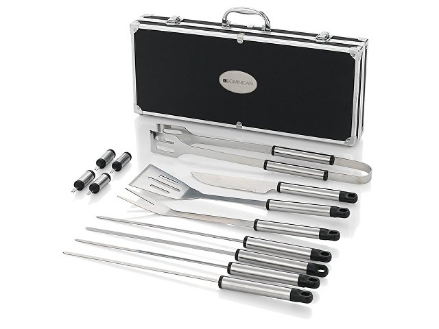 Набор для барбекю 12 предметов. 4 шампура, 4 шпажки для снятия шашлыка, нож, щипцы, вилка, лопатка. Шильд в комплекте 4,8 х 8,3 см.