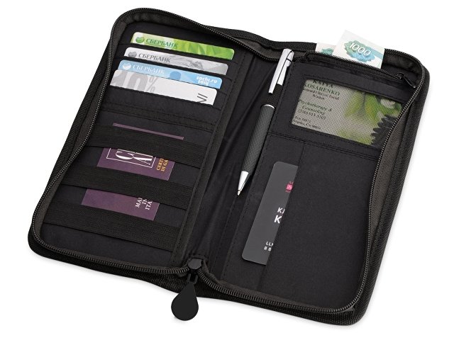 Портмоне для путешествий из прочного полиэстера сделает любую поездку более комфортной. Здесь предусмотрено место для паспорта, билетов и денег, кармашки для пластиковых карт, удобный держатель для ручки и фиксаторы на резинках для карточек или документов. Портмоне закрывается на молнию, а на его внешней стороне предусмотрен дополнительный карман для посадочного талона или других документов, которые приходится все время доставать. Портмоне «Вест» – прекрасный подарок для тех, кто любит путешествовать и проводит много времени в разъездах.
