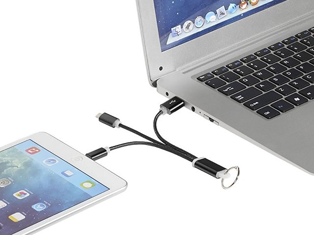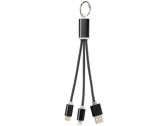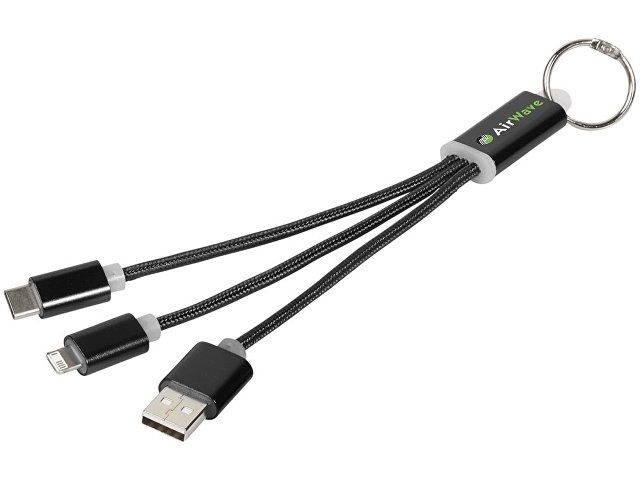 Кабель для зарядки Metal «3-в-1» с брелоком, коннекторами 1 type с, 1 USB type A и двойным совместимым коннектором «2-в-1» для устройств с ОС Apple® iOS и Android. В комплект входит брелок. Для зарядки устройств Apple подключайте кабель стороной без контактов; для зарядки устройств с ОС Android подключайте кабель стороной с контактами. Алюминий.