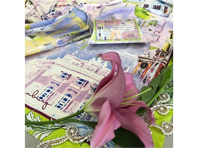 На платке изображены "Храм-Памятник на Крови во имя Всех святых, в земле Российской просиявших", здание Администрации города Екатеринбурга, Екатеринбургский Государственный академический Театр Оперы и Балета.