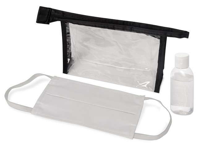 Самое необходимое всегда под рукой - в любом месте и при любой ситуации. Многоразовая хлопковая маска черного цвета и антисептик в стильной пластиковой косметичке поместятся в любой сумке.